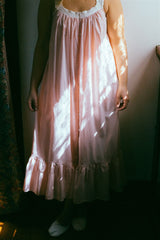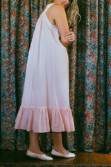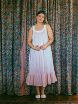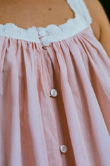 The best-selling Jodie now comes in a romantic soft pink hue, accented with a contrasting ivory trim at the collar. Featuring feminine broderie anglaise, embroidered straps and a generously shirred neckline with a button down front and flounced ruffle hem.